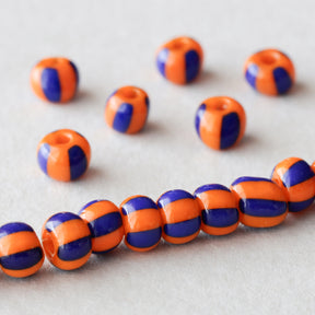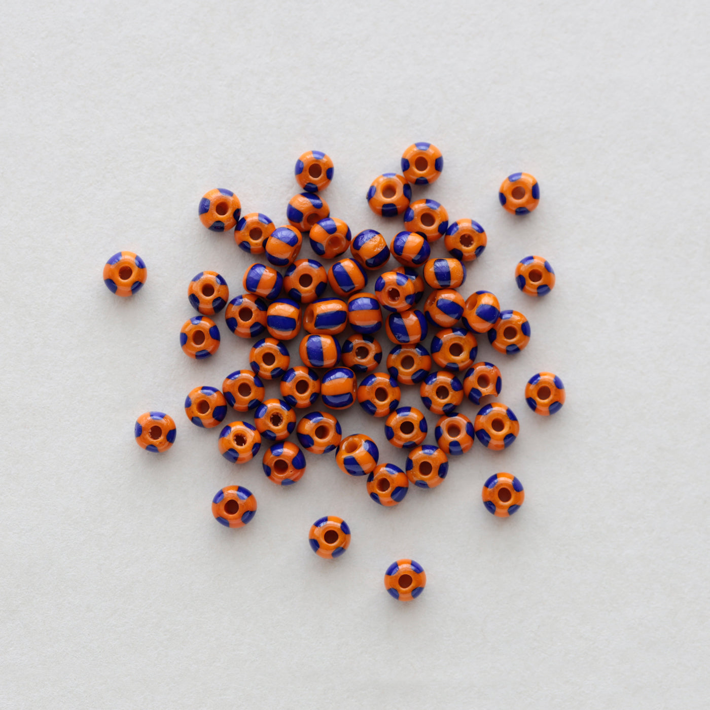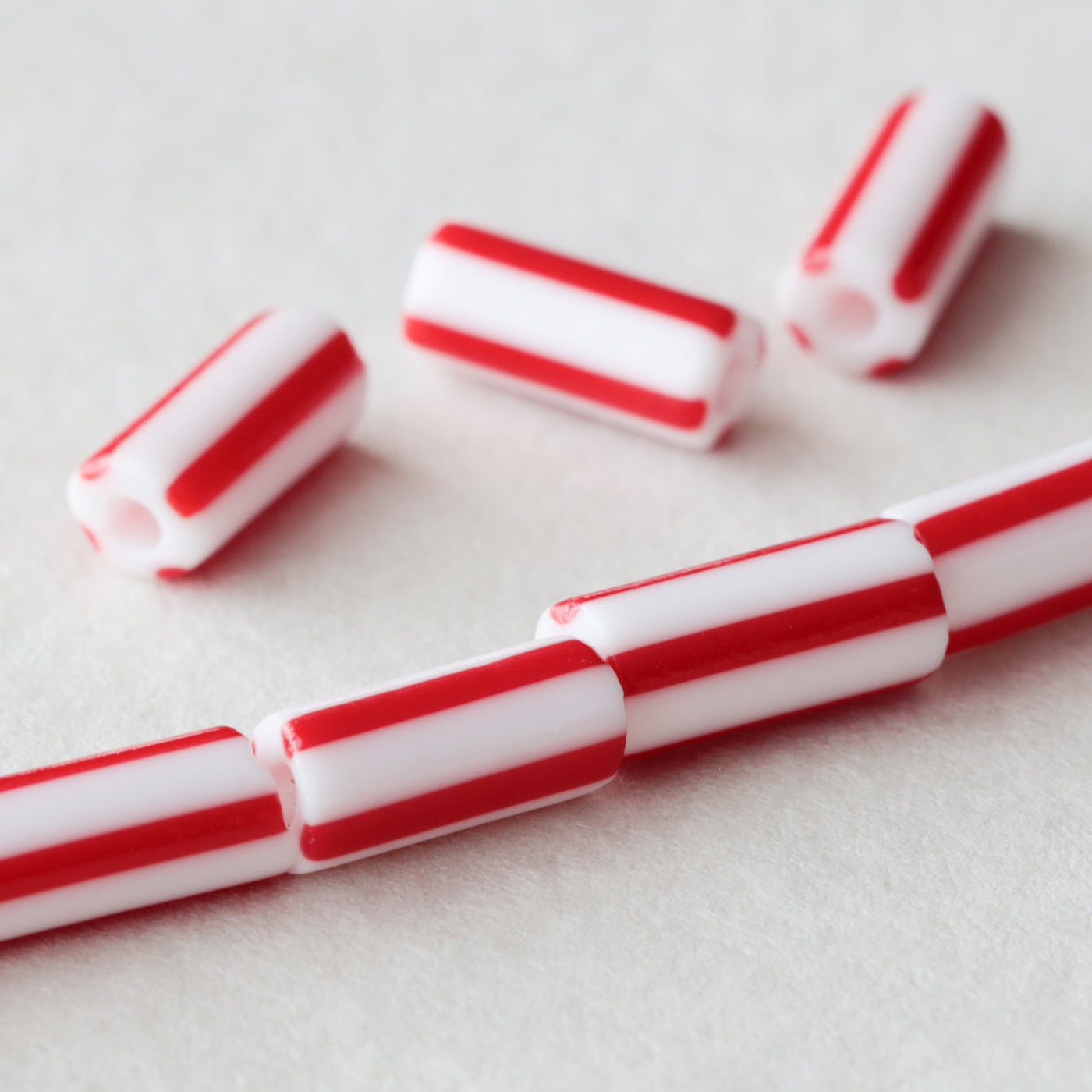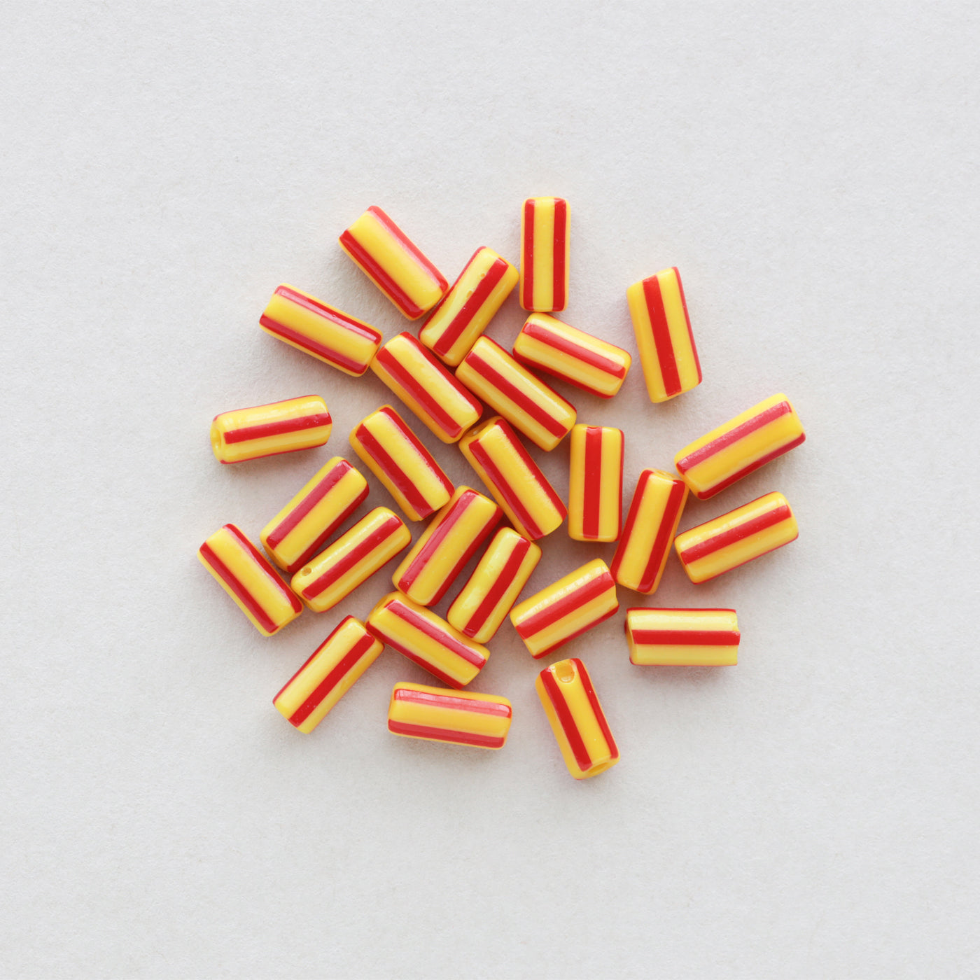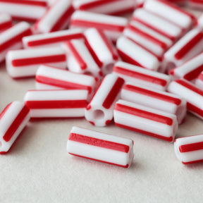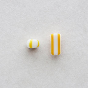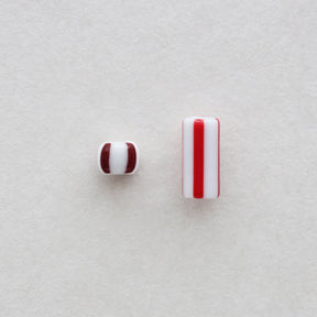丸みのあるタイヤ形やチューブ形に、ラフなストライプを引いたチェコ製のビーズです。ポップな印象のストライプ柄ですが、レトロなおもちゃのような、お菓子のような雰囲気も感じられます。白地にあざやかなカラーが引かれた王道のストライプ、瑞々しい透明感のあるもの、陶器のような質感に渋い色合わせのもの、あわく儚げな半透明のものなど、バリエーション豊富です。